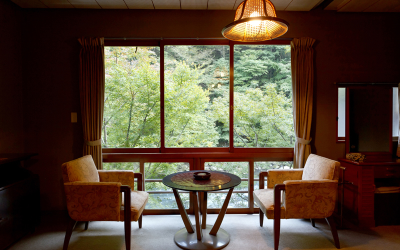 This room is on the third floor of wooden house. It has the greatest view of all rooms in our hotel; you can enjoy seasonal changes in the scenery of Yusaka-mountain, and smell of fragrant olives in late October.