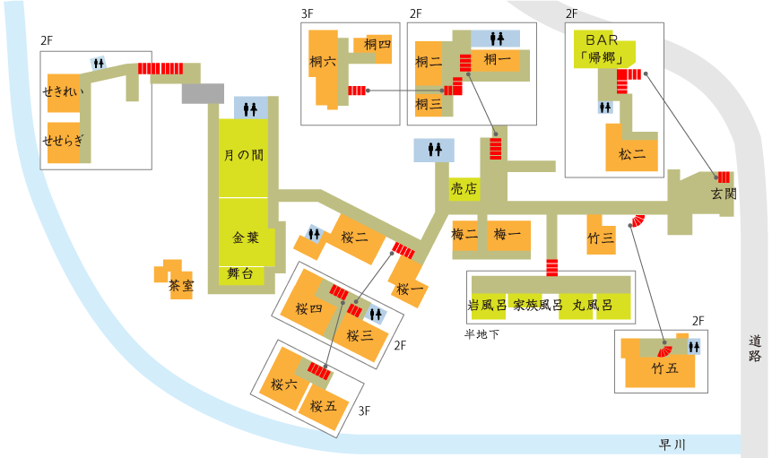 一部を除きどの部屋も建物を保持する上から水気を避けるために、浴室やトイレは部屋には付いていない昔のままとなっております。